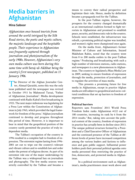 ia outlets during the Taliban regime, and a conservative religious society that subordinates women. However, Afghanistan’s media development remains incomplete. Since it still faces many challenges, the international community must continue to assist and support it. Three main processes contributed to Afghanistan’s initial media success: the proliferation of local media, especially radio; the government’s increased capacity to communicate; and international media that filled gaps that otherwise might have become problematic. This three-pronged approach in Afghanistan may provide useful lessons for other societies emerging from conflict." (Summary)