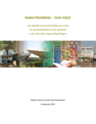 "Some recommendations can be made to Radio Progress and its community. The station seems to provide the Upper West people with what they needed – a voice to make themselves heard and to communicate with each other. Since the research showed that most limitations are due to the restraints in financ