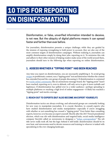 "For journalists, disinformation presents a unique challenge; while they are guided by the mission of exposing wrongdoing to hold power to account, they are also one of the most common targets of disinformation campaigns. Without realizing it, journalists can amplify disinformation simply by doing their jobs: reporting on it. To minimize this risk and adhere to their other mission of helping readers make sense of the world around them, journalists should turn to the following tips when reporting on online disinformation." (Page 1)