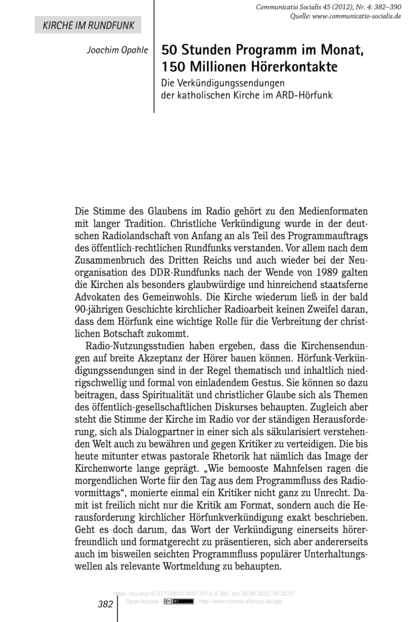 "Blickt man auf die Statistik aller derzeit angebotenen Kirchensendungen, zeigt sich, dass die Radio-Verkündigung schon rein quantitativ keineswegs eine zu vernachlässigende Medienaktivität der Kirchen darstellt. Die neun öffentlich-rechtlichen ARD-Sender sowie Deutschlandfunk und Deutschlandradio veranstalten 94 Hörfunkprogramme. 69 davon werden als klassische Hörfunkwellen terrestrisch ausgestrahlt (vgl. Funkkorrespondenz 37/2012). Von diesen 69 Wellen enthalten 42 Wellen konfessionelle Verkündigungsbeiträge. Die Arbeitsgemeinschaft der kirchlichen Senderbeauftragten in der ARD, die eine Statistik über Formate, Umfang und Reichweiten dieser sogenannten Verkündigungssendungen führt, hat im November 2012 erhoben, dass in der Summe allein in katholischer Verantwortung bundesweit monatlich etwa 50 Stunden Hörfunkprogramm ausgestrahlt werden. Die Daten auf evangelischer Seite sind entsprechend. Waren es in den Anfängen des Radios zumeist klassische Wortbeiträge nach Art der „Worte für den Tag“, haben sich die Formate kirchlicher Sendungen in den zurückliegenden Jahrzehnten deutlich diversifiziert und nach Zielgruppen spezifiziert. Die Formatvielfalt reicht von anderthalbminütigen Spots bis zu Halbstunden-Features. Dabei bedient man sich einer bunten Palette radiophoner Gestaltungselemente (Musik, O-Töne, Atmo, Interview). Nicht zu vergessen: die in der Regel einstündigen Live-Gottesdienstübertragungen. Den größten Anteil an kirchlichen Sendungen bilden mit etwa 60 Prozent die „Kurzverkündigungen“, die auf allen Wellen anzutreffen sind. Die Formate heißen „Worte für den Tag“, „Worte auf den Weg“, „Morgengruß“, „Anstoß“ oder „Zwischenruf“ und bewegen sich in einer Länge von 1:30 Min. (z.B. MDR, „Augenblick mal“) bis 4:30 Min. (Deutschlandfunk, „Morgenandacht“). Ein Großteil dieser Beiträge läuft in den Morgenstunden zwischen 5:45 und 10 Uhr, also zur Radio-Primetime. Seit einigen Jahren haben sich auch abendliche und nächtliche Beiträge hinzugesellt, die als „Abendsegen“ (rbb) oder „Gedanken zur Nacht“ (MDR) von besinnlichem Charakter sind. Eine ähnliche Absicht verfolgen die etwa anderthalbminütigen „Nachtgedanken“ (rbb). Dabei handelt es sich um von kirchlichen Redaktionen ausgesuchte Literaturzitate, die zum Nachdenken anregen." (Seite 383-384)