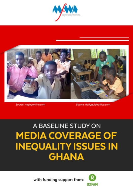 "The study found that the media gives only 12% coverage to inequality issues in Ghana. Thus, across the 22 media outlets, 783 stories focused on inequalities out of a total of 6,477 stories monitored. It was also observed the media’s attention is largely focused on social inequalities overlooking other forms like economic and political inequalities among citizens. Moreover, 68% of the stories that focused on inequalities were generated through already made or routine news sources such as coverage of press conferences and events, as against enterprising means of generating stories. This indicates the media’s lackluster commitment to the coverage of inequality issues. The study further found that 6 out 10 of the stories on inequality were framed episodically. Thus, majority of the stories were treated as single, isolated incidents of inequality rather than being part of a bigger or broader issue of widespread inequality. It is, therefore, recommended that, given the gap in inequality reporting as observed through the study, journalists and editors are trained to increase their knowledge on inequality issues and also equipped with the requisite skills to report inequalities for impact and policy redress." (Executive summary)