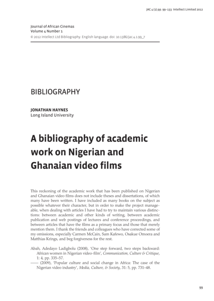 "This reckoning of the academic work that has been published on Nigerian and Ghanaian video films does not include theses and dissertations, of which many have been written. I have included as many books on the subject as possible whatever their character, but in order to make the project manageable,when dealing with articles I have had to try to maintain various distinctions: between academic and other kinds of writing, between academic publication and web postings of lectures and conference proceedings, and between articles that have the films as a primary focus and those that merely mention them. I thank the friends and colleagues who have corrected some of my omissions, especially Carmen McCain, Sam Kafewo, Osakue Omoera and Matthias Krings, and beg forgiveness for the rest." (Abstract)