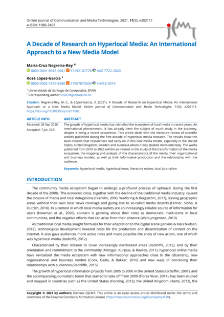 "The growth of hyperlocal media has rekindled the ecosystem of local media in recent years. An international phenomenon, it has already been the subject of much study in the academy, despite it being a recent occurrence. This article deals with the literature review of scientific articles published during the first decade of hyperlocal media research. The results show the keen interest that researchers had early on in this new media model, especially in the United States, United Kingdom, Sweden and Australia where it was studied more intensely. The works published from 2010 to 2020 exhibit an interest in the study of the transformation of the media ecosystem, the mapping and analysis of the characteristics of the media, their organizational and business models, as well as their informative production and the relationship with the audience." (Abstract)