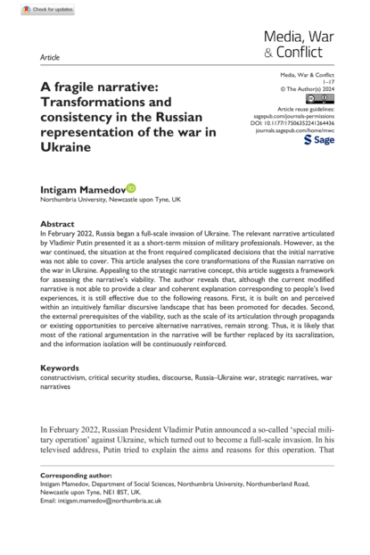 "In February 2022, Russia began a full-scale invasion of Ukraine. The relevant narrative articulated by Vladimir Putin presented it as a short-term mission of military professionals. However, as the war continued, the situation at the front required complicated decisions that the initial narrative was not able to cover. This article analyses the core transformations of the Russian narrative on the war in Ukraine. Appealing to the strategic narrative concept, this article suggests a framework for assessing the narrative’s viability. The author reveals that, although the current modified narrative is not able to provide a clear and coherent explanation corresponding to people’s lived experiences, it is still effective due to the following reasons. First, it is built on and perceived within an intuitively familiar discursive landscape that has been promoted for decades. Second, the external prerequisites of the viability, such as the scale of its articulation through propaganda or existing opportunities to perceive alternative narratives, remain strong. Thus, it is likely that most of the rational argumentation in the narrative will be further replaced by its sacralization, and the information isolation will be continuously reinforced." (Abstract)