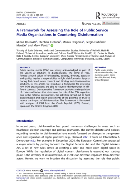 "Public service media (PSM) are widely acknowledged as part of the variety of solutions to disinformation. The remit of PSM, formed around values of universality, equality, diversity, accuracy and quality, implies a responsibility to fight disinformation by producing fact-based news content and finding anti-disinformation solutions. In this article, we introduce a framework for assessing how PSM organizations are able to counter disinformation in different contexts. Our normative framework provides a triangulation of contextual factors that determine the role of the PSM organization in the national environment, the activities carried out to fight disinformation and expert assessments of the potential of PSM to reduce the impact of disinformation. The framework is illustrated with analyses of PSM from the Czech Republic (CZE), Finland, Spain and the United Kingdom (UK)." (Abstract)