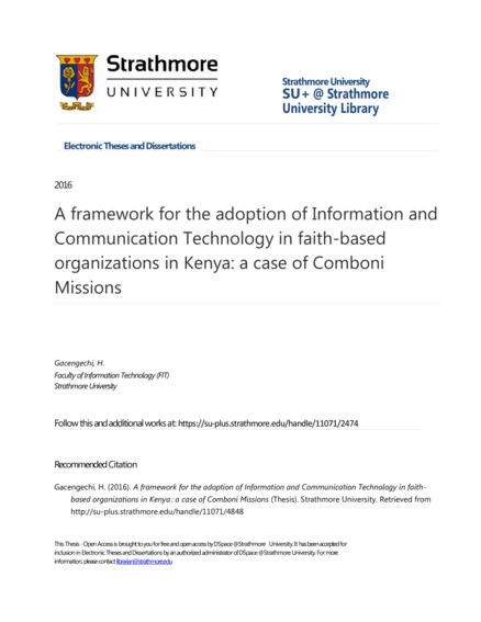 "This research covers the adoption of ICT in Comboni missions, a faith-based organization with operations in Kenya among other global countries. Comboni missions focus on less developed Kenya counties, and in economically challenged areas such as slums in Mathare, Korogocho, Kariobangi in Nairobi. Regarding ICT adoption in Comboni missions and other faith-based organizations in Kenya, there is little empirical data available. The reasons are neglect by organization and information theorists who have focused on for-profit organizations and the unique nature of most faith-based organizations in general. Comboni missions are unique in terms of organizational culture and values, in their economies and in focus. They are faith-based and mostly voluntary in nature and seek no profits. Their economies are donor-dependent. They focus on accountability of received funds rather seek to attain competitive advantage. Donor funds allowing, ICT adoption may be adopted in a mission. This adoption is in isolation and without policy guidelines. The problem is haphazard adoption leading to poor adoption and low quality systems. To solve this problem, this study proposes a framework of how Comboni missions should adopt ICT; the unified theory of acceptance and use of technology, (UTAUT).The framework proposes that Comboni missions device a policy to govern ICT adoption; involve stakeholders in the adoption, besides lending support in ICT infrastructure development where needed. The framework was validated and tested for accuracy through the inferential statistics (regression analysis model) at 5% level of confidence. The significance of the study is that by adopting ICT, Comboni missions will bridge the organizational divide; or attain the capacity and competence to adapt business and technological capacities of private and public organizations to be digitally competent. The Comboni missions would also bridge the digital divide currently plaguing the underdeveloped areas and the slums where Comboni missions offer services. The study findings are that policy, user behaviour, ICT infrastructure and community determine ICT adoption in Comboni missions and similar faith-based organizations." (Abstract)