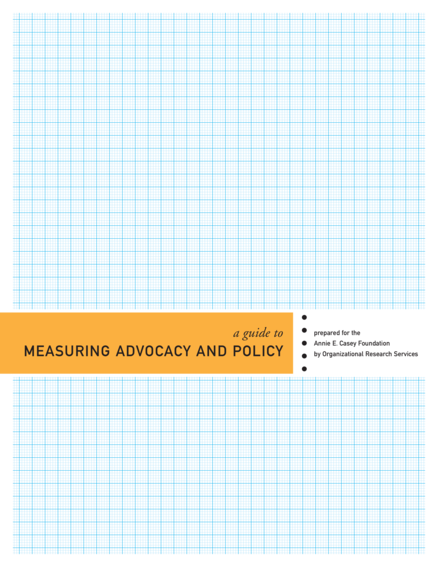 "The overall purpose of this guide is twofold. To help grantmakers think about and talk about measurement of advocacy and policy, this guide puts forth a framework for naming outcomes associated with advocacy and policy work as well as directions for evaluation design. The framework is intended to provide a common way to identify and talk about outcomes, providing philanthropic and non-profit audiences an opportunity to react to, refine and adopt the outcome categories presented. In addition, grantmakers can consider some key directions for evaluation design that include a broad range of methodologies, intensities, audiences, timeframes and purposes." (Introduction, page 1)