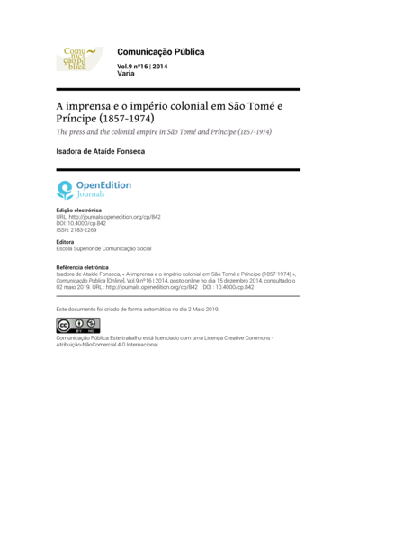 "Analisar a trajectória e o desempenho da imprensa em São Tomé e Príncipe ao longo docolonialismo é o objectivo deste artigo. Observam-se os papéis desempenhados pelo jornalismo no contexto sociopolítico do arquipélago no período colonial, entre 1857 e 1974. Para se compreender o percurso da imprensa e a sua i nterdependência do contexto político, aplicam-se as teorias do jornalismo e dos sistemas de imprensa em regimes liberais e autoritários. A investigação envolveu pesquisa em fontes primárias e secundárias, e o artigo sistematiza o legado da imprensa colonial e produz uma síntese sobre as relações entre a imprensa e o colonialismo." (Resumo)