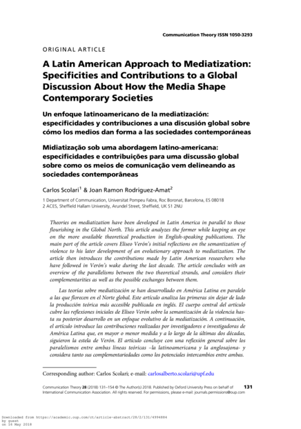 "Theories on mediatization have been developed in Latin America in parallel to those flourishing in the Global North. This article analyzes the former while keeping an eye on the more available theoretical production in English-speaking publications. The main part of the article covers Eliseo Verón’s initial reflections on the semantization of violence to his later development of an evolutionary approach to mediatization. The article then introduces the contributions made by Latin American researchers who have followed in Verón’s wake during the last decade. The article concludes with an overview of the parallelisms between the two theoretical strands, and considers their complementarities as well as the possible exchanges between them." (Abstract)