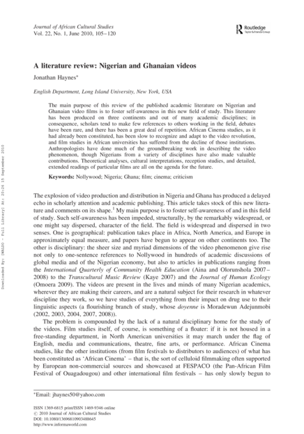 "The main purpose of this review of the published academic literature on Nigerian and Ghanaian video films is to foster self-awareness in this new field of study. This literature has been produced on three continents and out of many academic disciplines; in consequence, scholars tend to make few references to others working in the field, debates have been rare, and there has been a great deal of repetition. African Cinema studies, as it had already been constituted, has been slow to recognize and adapt to the video revolution, and film studies in African universities has suffered from the decline of those institutions. Anthropologists have done much of the groundbreaking work in describing the video phenomenon, though Nigerians from a variety of disciplines have also made valuable contributions. Theoretical analyses, cultural interpretations, reception studies, and detailed, extended readings of particular films are all on the agenda for the future."