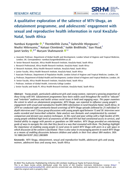 "This paper examines the extent to which an edutainment programme, MTV-Shuga, was reported to influence young people’s engagement with sexual and reproductive health (SRH) information in rural KwaZulu-Natal, South Africa. In 2019 we conducted eight community-based screenings of MTV-Shuga episodes followed by 25 individual indepth interviews and 13 focus group discussions with young people aged between 15 and 30. Interviews were audio recorded and transcribed verbatim. Data analysis was thematic and complemented by constant comparison and deviant case analysis techniques. In this rural and poor setting with a high burden of HIV, young people exhibited high levels of awareness of SRH and HIV but had constrained access to services, and limited ability to engage with parents or guardians on SRH matters. MTV Shuga provided an entertaining guide of ways to navigate the risks that they faced in a way that resonated with them. The findings highlight the importance of enabling young people in rural areas to watch MTV Shuga with peers in a safe space in which discussion of the content is facilitated. There is also value in encouraging parents to watch MTV Shuga as a means of enabling discussions between children and adults in their lives about SRH matters." (Abstract)