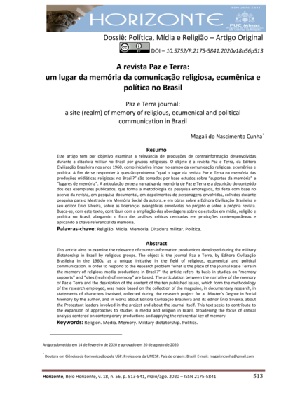 "Este artigo tem por objetivo examinar a relevância de produções de contrainformação desenvolvidas durante a ditadura militar no Brasil por grupos religiosos. O objeto é a revista Paz e Terra, da Editora Civilização Brasileira nos anos 1960, como iniciativa ímpar no campo da comunicação religiosa, ecumênica e política. A fim de se responder à questão-problema “qual o lugar da revista Paz e Terra na memória das produções midiáticas religiosas no Brasil?” são tomados por base estudos sobre “suportes da memória” e “lugares de memória”. A articulação entre a narrativa da memória de Paz e Terra e a descrição do conteúdo dos dez exemplares publicados, que forma a metodologia da pesquisa empregada, foi feita com base no acervo da revista, em pesquisa documental, em depoimentos de personagens envolvidas, colhidos durante pesquisa para o Mestrado em Memória Social da autora, e em obras sobre a Editora Civilização Brasileira e seu editor Ênio Silveira, sobre as lideranças evangélicas envolvidas no projeto e sobre a própria revista." (Resumo)
