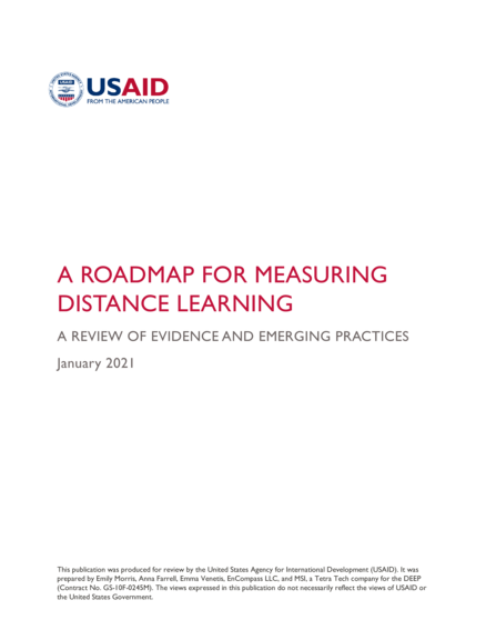 "The purpose of this review is to support education practitioners, host country government representatives, donors, implementers, non-governmental organizations (NGOs), civil society organizations, and other stakeholders in applying best practices to monitor and evaluate distance learning initiatives designed for diverse learners and implemented both within and outside of learning institutions. This review covers the four key distance learning modalities: radio/audio, television/video, mobile phone, and online learning. Printed texts, which are often developed to accompany these first four modalities, can also be a fifth modality in contexts where technology is not used. Most of the data sources were drawn from work in the primary education sub-sector. However, much of the guidance can be applied to secondary and tertiary-level distance learning. This review is also applicable to data collection in both crisis and non-crisis contexts. This review presents a roadmap that guides users through four steps of planning and designing how distance learning delivered through any of these modalities can be monitored and evaluated. Step 1: Determine the Objectives of Monitoring and Evaluating Distance Learning; Step 2: Determine What Will Be Measured (Reach, Engagement, and Outcomes); Step 3: Determine How Data Will Be Collected (In-Person or Remotely); Step 4: Determine the Methods and Approaches for Measurement. Based on emerging global evidence, this review guides users through the process of measuring the reach, engagement, and outcomes of distance learning initiatives. In addition to providing step-by-step guidance, this review provides three overarching recommendations for developing and implementing evidence-based monitoring, evaluation, and learning (MEL) plans for distance learning initiatives." (Executive summary)