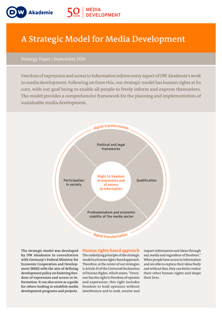"Freedom of expression and access to information inform every aspect of DW Akademie’s work in media development. Following on from this, our strategic model has human rights at its core, with our goal being to enable all people to freely inform and express themselves. The model provides a comprehensive framework for the planning and implementation of sustainable media development." (Page 1)