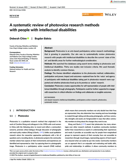 "Photovoice is an arts-based participatory action research methodology that is growing in popularity. Our aim was to systematically review photovoice research with people with intellectual disabilities to describe the current'state of the art' and identify areas for further methodological consideration. We searched five databases using search terms relating to photovoice and intellectual disabilities. Thirty-one studies met inclusion criteria. We used thematic analysis to identify common themes. themes identified-adaptations to the photovoice method, collaboration, participation and power, impact and outcomes-explored how far the'voice'and agency of participants with intellectual disabilities taking part in photovoice research were sup-ported and whether photovoice lived up to its promise as'action'research. Photovoice creates opportunities for self-representation of people with intellectual disabilities through photography. Participants could be further supported to engage with researchers in critical reflection on findings and collaborate on tangible outcomes." (Abstract)