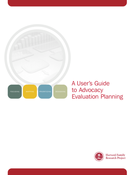 "Although the argument for evaluating advocacy is convincing, advocacy has long been considered “too hard to measure,” and so far relatively few advocates, funders, or evaluators have taken on the challenge. But this is now changing. Interest in advocacy evaluation is surging and cutting-edge advocates are embracing evaluation as a critical part of their work. The main barrier preventing more organizations from using evaluation is a lack of familiarity with how to think about and design evaluations of advocacy efforts that are useful, manageable, and resource-efficient. Even knowing where to start can be a challenge. This tool was developed to help address that gap in knowledge. It guides users through four basic steps of advocacy evaluation planning." (Page 3)