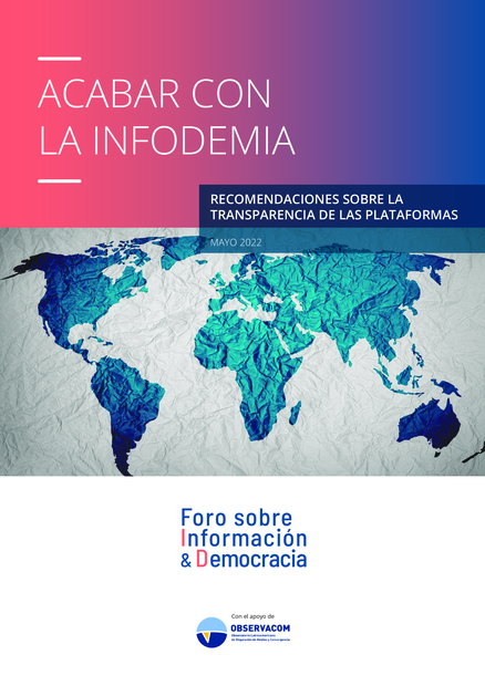 "Publicadas en noviembre de 2020, las recomendaciones del Foro sobre transparencia de las plataformas digitales resultantes del informe “Cómo acabar con la infodemia” figuran en la agenda de la Conferencia Mundial sobre la Libertad de Prensa de la UNESCO que se celebra en Punta del Este (Uruguay). En esta ocasión, estas recomendaciones se han traducido al español con el apoyo de Observacom, miembro del Consejo de Administración del Foro. Estas recomendaciones son el resultado del grupo de trabajo sobre infodemia copresidido por Maria Ressa, Premio Nobel de la Paz 2021, y Marietje Schaake, actual Directora de Política Internacional del Centro de Ciberpolítica de la Universidad de Stanford. El informe del grupo se publicó en noviembre de 2020 y figuró en el orden del día de la primera Cumbre sobre Información y Democracia, celebrada al margen de la Asamblea General de la ONU en septiembre del 2021." (Publisher description)