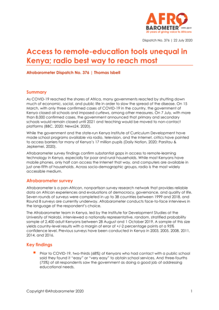 "As the COVID-19 pandemic continues to spread across Africa, educators, policy makers, parents, and pupils face uncertainty about the path forward. In Kenya, the government has halted all in-person teaching at the primary and secondary levels and moved to remote teaching. Survey findings show, however, how unequal access to the necessary technology is in Kenya. While regular Internet use has grown fourfold in the past decade, half of Kenyans remain offline. This is especially common in poor, rural, and less educated families, who face the prospect of being left even further behind. Radio caters to the broadest audience in Kenya, though teaching possibilities are no doubt more limited than online. To ensure inclusion and participation in online learning in the medium and longer term, the government will need to activate plans and investments capable of building e-learning infrastructure that facilitates access for all students." (Conclusion)