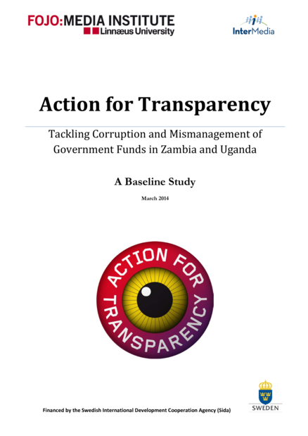 "The purpose of the study is to provide baseline data and research-driven recommendations to help inform and later evaluate the impact of ‘Action for Transparency’. Action for Transparency is a three-year, media-for-development programme, managed by Fojo and its partners and funded by the Swedish International Development Cooperation Agency (Sida). The programme is designed to help tackle corruption and mismanagement of government funds in Zambia and Uganda by putting the power to change in the hands of citizens. Action for Transparency comprises three phases of targeted interventions designed to catalyse a culture of accountability and transparency through a ripple out effect. The three phases include: 1. Training for up to 4,000 journalists, civil society representatives and public sector employees in Zambia and Uganda on how to access, analyse and communicate information on government spending. 2. Development of ICT tools, including an online application (app) which enables users to compare the amount of government money pledged to specific schools and health clinics against their own observations of what appears to have been spent. 3. Public awareness campaign, through which those who took part in the initial training will launch and champion the new ICT tools, nationally, and raise awareness through a range of promotional activities. This study presents baseline data and findings that will inform and later help evaluate the overall3 impact of the three phases on participating journalists and civil society representatives, and their capacity to (a) access (b) analyse and (c) communicate information about government spending." (Introduction, page 4)