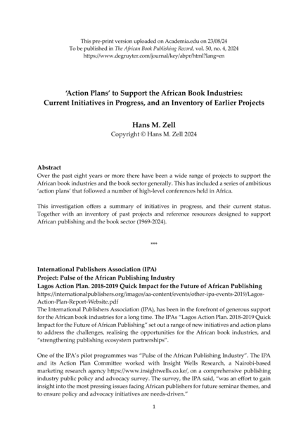 "Over the past eight years or more there have been a wide range of projects to support the African book industries and the book sector generally. This has included a series of ambitious ‘action plans’ that followed a number of high-level conferences held in Africa. This investigation offers a summary of initiatives in progress, and their current status. Together with an inventory of past projects and reference resources designed to support African publishing and the book sector (1969-2024)." (Abstract)