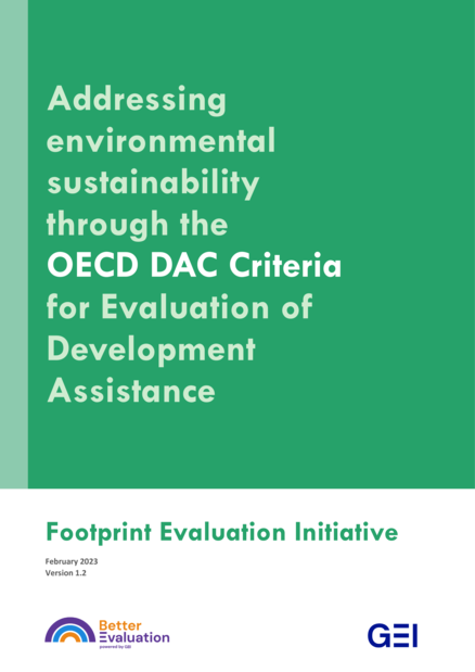 "This document discusses how the six evaluation criteria of the OECD DAC (Organization for Economic Co-Operation and Development – Development Assistance Committee) can be used to get environmental sustainability on the agenda for evaluations and monitoring. These criteria are widely used in international development organisations, and similar criteria are often used in other organisations. This document is based on existing guidance produced by OECD DAC (OECD, 2021) with additional commentary from the members of the Footprint Evaluation Initiative." (Summary, page 1)