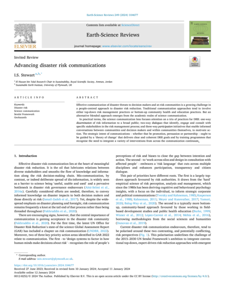 "Effective communication of disaster threats to decision makers and at-risk communities is a growing challenge in a people-centred approach to disaster risk reduction. Traditional communication approaches tend to involve either top-down risk management practices or bottom-up community health and education practices. But an alternative blended approach emerges from the academic realm of science communication. In practical terms, the science communication lens focuses attention on a trio of practices for DRR: one-way dissemination of risk information to a broad public; two-way dialogues that identify, engage and consult with specific stakeholders in the risk management process; and three-way participation initiatives that enable informed conversations between communities and decision makers and within communities themselves, to motivate action. The strategic intent of communications – whether that be promotion, persuasion or partnership – ought to be guided by a ‘theory of change’ that delivers clear and coherent DRR goals and by training programmes that recognise the need to integrate a variety of interventions from across the communication continuum." (Abstract)
