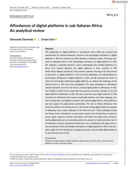"This paper presents an analytical review of the technological affordances of digital platforms in SSA. We adopted a systematic literature review methodology that entailed gathering evidence from relevant literature and digital platforms in three countries in SSA (South Africa, Nigeria, and Kenya). Three research questions focusing on (i) critical issues of discussion on digital platforms in SSA and their distribution; (ii) understanding the technological affordances of digital platforms in SSA; and (iii) assessing the extent to which the technological affordances digital platforms can address the challenges of the informal sector in SSA drove the investigation. The study developed an affordances criteria framework, the first of its kind, to evaluate digital platforms affordances in SSA. Our findings revealed the key topics that have gained researchers' attention so far and digital platforms distribution in SSA. We also found that most digital platforms in SSA currently lack affordances that support multimodal interface and native language contents, limiting their accessibility to persons with minimal digital literacy. Most platforms also lack support for public/private partnerships. The lack of critical affordances that match the profile of the informal sector in SSA makes existing digital platforms incapable of addressing many critical challenges of the informal sector. These challenges include low literacy levels, minimal/lack of government support, lack of electricity or expensive power supply, expensive internet connectivity, and health and safety issues. However, existing digital platforms can reasonably address the absence of social protection, lack of formalization, and poor operational infrastructure." (Abstract)
