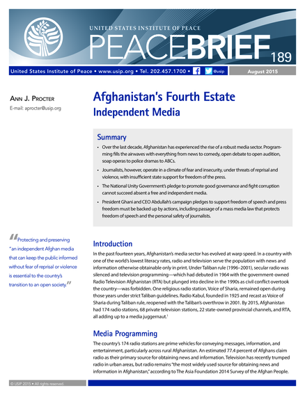 "Over the last decade, Afghanistan has experienced the rise of a robust media sector. Programming fills the airwaves with everything from news to comedy, open debate to open audition, soap operas to police dramas to ABCs. Journalists, however, operate in a climate of fear and insecurity, under threats of reprisal and violence, with insufficient state support for freedom of the press. The National Unity Government’s pledge to promote good governance and fight corruption cannot succeed absent a free and independent media. President Ghani and CEO Abdullah’s campaign pledges to support freedom of speech and press freedom must be backed up by actions, including passage of a mass media law that protects freedom of speech and the personal safety of journalists." (Summary)