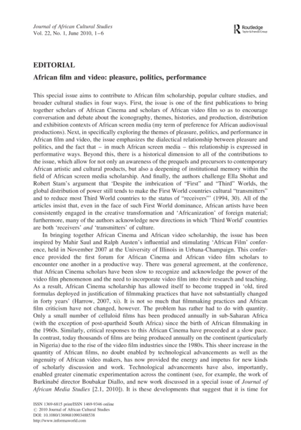 "This special issue aims to contribute to African film scholarship, popular culture studies, and broader cultural studies in four ways. First, the issue is one of the first publications to bring together scholars of African Cinema and scholars of African video film so as to encourage conversation and debate about the iconography, themes, histories, and production, distribution and exhibition contexts of African screen media (my term of preference for African audiovisual productions). Next, in specifically exploring the themes of pleasure, politics, and performance in African film and video, the issue emphasizes the dialectical relationship between pleasure and politics, and the fact that – in much African screen media – this relationship is expressed in performative ways. Beyond this, there is a historical dimension to all of the contributions to the issue, which allow for not only an awareness of the prequels and precursors to contemporary African artistic and cultural products, but also a deepening of institutional memory within the field of African screen media scholarship." (Editorial)
