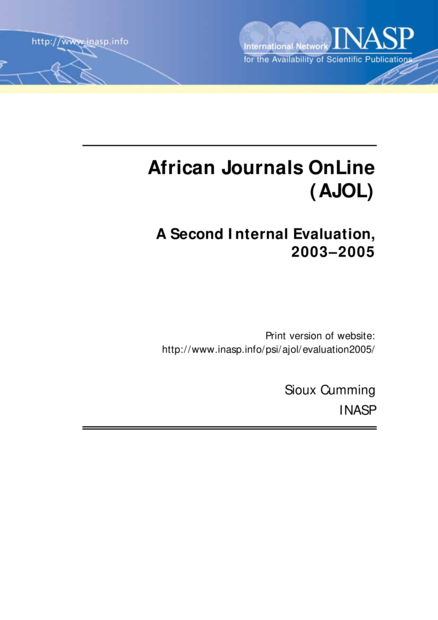"A second evaluation of the African Journals Online (AJOL) project http://www.ajol.info/, which examines the development and status of the project since the last evaluation in 2002 to the end of 2005, and when it was handed over to African management, NISC South Africa Ltd. It aims to provide participating journals with information about the use of their journals within the AJOL service, and offers a variety of analysis, including number of page requests for each journal, registered users of the service, a record and analysis of document delivery requests fulfilled, by country of publication, by journal, and by subject. There is also analysis about the nature of AJOL registered users, collected through a questionnaire mailing, which examines usage information, and areas of special interest of AJOL users. A series of appendices provide tables showing the number of hits per journal for the 2004-2005 period (although these could be somewhat misleading, and number of unique visits to each journal’s AJOL Web pages might give a better idea of the interest in any journal), document delivery requests for each journal, and email alerts requested for each." (Hans M. Zell, Publishing, Books & Reading in Sub-Saharan Africa, 3d ed. 2008, nr. 1932)