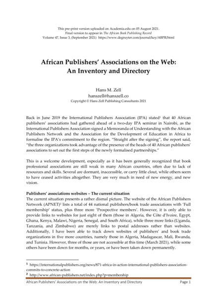 "Back in June 2019 the International Publishers Association (IPA) stated that 40 African publishers’ associations had gathered ahead of a two-day IPA seminar in Nairobi, as the International Publishers Association signed a Memoranda of Understanding with the African Publishers Network and the Association for the Development of Education in Africa to formalise the IPA’s commitment to the region. “Straight after the signing”, the report said, “the three organizations took advantage of the presence of the heads of 40 African publishers’ associations to set out the first steps of the newly formalised partnerships.” This is a welcome development, especially as it has been generally recognized that book professional associations are still weak in many African countries, often due to lack of resources and skills. Several are dormant, inaccessible, or carry little clout, while others seem to have ceased activities altogether. They are very much in need of new energy, and new vision." (Abstract)