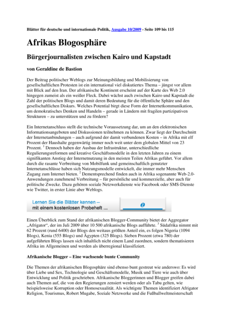 "Zwar liegt der Durchschnitt der Internetanbindungen – auch aufgrund der damit verbundenen Kosten – in Afrika mit elf Prozent der Haushalte gegenwärtig immer noch weit unter dem globalen Mittel von 23 Prozent. Dennoch haben der Ausbau der Infrastruktur, unterschiedliche Regulierungsreformen und kreative Geschäftsmodelle in den letzten Jahren zu einem signifikanten Anstieg der Internetnutzung in den meisten Teilen Afrikas geführt. Vor allem durch die rasante Verbreitung von Mobilfunk und gemeinschaftlich genutzter Internetanschlüsse haben sich Nutzungsmodelle entwickelt, die immer mehr Menschen Zugang zum Internet bieten. Dementsprechend finden auch in Afrika sogenannte Web-2.0-Anwendungen zunehmend Verbreitung – für persönliche und kommerzielle, aber auch für politische Zwecke. Dazu gehören soziale Netzwerkdienste wie Facebook oder SMS-Dienste wie Twitter, in erster Linie aber Weblogs. Einen Überblick zum Stand der afrikanischen Blogger-Community bietet der Aggregator „Afrigator“, der im Juli 2009 über 10 500 afrikanische Blogs aufführte. Südafrika nimmt mit 62 Prozent (rund 6400) der Blogs den weitaus größten Anteil ein, es folgen Nigeria (1094 Blogs), Kenia (555 Blogs) und Ägypten (325 Blogs)." (Seite 109)
