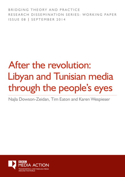 "This BBC Media Action Bridging Theory and Practice working paper, is based on data drawn from surveys and focus groups conducted in Libya and Tunisia between March 2013 and March 2014. The paper takes the form of two separate case studies (parts 2 and 3) setting out the findings for each country, followed by a concluding section that draws out comparisons and differences between the two." (Page 5)