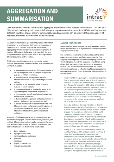"CSOs sometimes need to summarise or aggregate information across multiple interventions. This can be a difficult and challenging task, especially for large non-governmental organisations (NGOs) working in many different countries and/or sectors. Summarisation and aggregation can be achieved through a variety of methods. However, all come with associated costs." (Introduction)