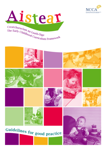 "Aistear is the curriculum framework for children from birth to six years in Ireland. It describes learning and development through the four interconnected themes of Well-being, Identity and Belonging, Communicating, and Exploring and Thinking. Four sets of guidelines, focusing on different aspects of pedagogy, describe how the adult can support children’s learning and development across these themes. The guidelines focus on building partnerships between parents and practitioners; learning and developing through interactions; learning and developing through play; supporting learning and development through assessment. The guidelines describe good practice and use a number of learning experiences to show what this practice might look like. While these learning experiences usually focus on a particular age group of children and a particular type of setting, many of them can be adapted to suit other age groups and other settings. 'Thinking about my practice' questions help the adult reflect on what he/she does and says to support children’s learning and development." (Introduction, page 5)