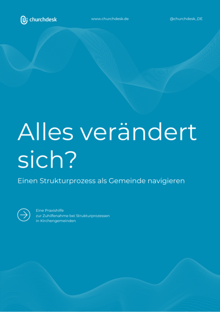 "Kaum ein Thema schwebt so drohend über Kirchengemeinden wie das Thema Strukturprozesse. Wir sind überzeugt, dass diese Herausforderung leichter bewältigt werden kann, wenn man von Menschen lernen kann, die aus der Praxis berichten können. Wir sind täglich in Kontakt mit tausenden Gemeinden verschiedener Konfessionen. Diesen Einblick möchten wir mit Ihnen teilen. Auf über 20 Seiten haben wir in diesem Guide die Kerninhalte zahlreicher Gespräche mit Gemeinden und Expert:innen aus der Gemeinde- und Organisationsberatung für Sie zusammengefasst." (https://explore.churchdesk.com)