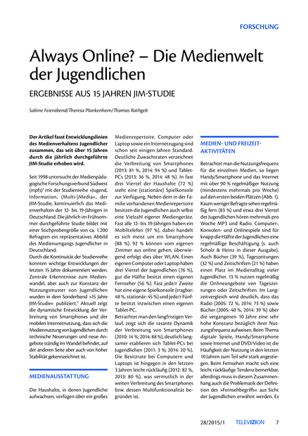 "Seit 1998 untersucht der Medienpädagogische Forschungsverbund Südwest (mpfs) mit der Studienreihe »Jugend, Information, (Multi-)Media«, der JIM-Studie, kontinuierlich das Medienverhalten der 12- bis 19-Jährigen in Deutschland. Die jährlich im Frühsommer durchgeführte Studie bildet mit einer Stichprobengröße von ca. 1.200 Befragten ein repräsentatives Abbild des Medienumgangs Jugendlicher in Deutschland. Durch die Kontinuität der Studienreihe konnten wichtige Entwicklungen der letzten 15 Jahre dokumentiert werden. Zentrale Erkenntnisse zum Medienwandel, aber auch zur Konstanz der Nutzungsmuster von Jugendlichen wurden in dem Sonderband »15 Jahre JIM-Studie« publiziert. Aktuell zeigt die dynamische Entwicklung der Verbreitung von Smartphones und der mobilen Internetnutzung, dass sich die Mediennutzung von Jugendlichen durch technische Neuerungen und neue Angebote ständig im Wandel befindet, auf der anderen Seite aber auch von hoher Stabilität gekennzeichnet ist." (Seite 7)