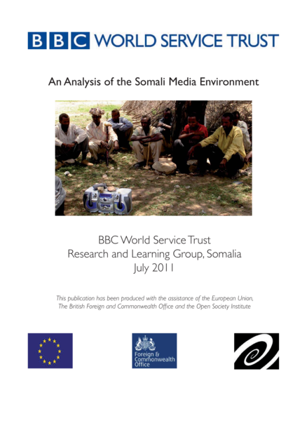 "In 2006 the BBC World Service Trust (BBC WST), funded by the UK Department for International Development, conducted research into media in 17 countries across sub-Saharan Africa in order to identify priorities for future media development initiatives. A series of African Media Development Initiative (AMDI) reports were produced, and this Media Sector Analysis builds on the Somalia component of that work. This analysis has been produced in consultation with media stakeholders and is grounded in a review of previously published material. The report is just one component of a larger media development project being delivered by the BBC WST entitled ‘Strengthening Radio Stations in Somalia to Promote Human Rights, Peace and Governance’ - a two-year project which aims to enhance the reach, levels of audience participation and professional capacity of Somali media. The media, and specifically, radio, is seen as a key local institution well placed to promote individual human and civil rights, freedom of expression and democratic dialogue. The project is informed by a rights perspective, ensuring that actions separately and collectively empower marginalised citizens, in particular, women and young people, to engage in direct dialogue with local authorities and thus have improved access to their civil and political rights. The project comprises two other strands in addition to the Media Sector Analysis: Capacity-building in six Somali radio stations [...]; media-related training for civil society rganisations [...] this report will inform the above project strands, as well as providing a basis for the development of media policy in the Somali region." (Foreword)