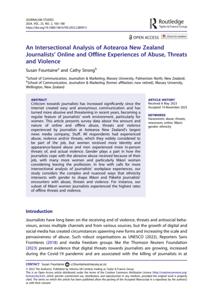"Criticism towards journalists has increased significantly since the internet created easy and anonymous communication and has turned more abusive and threatening in recent years, becoming a regular feature of journalists’ work environment, particularly for women. This article presents survey data about the amount and nature of online and offline abuse, threats and violence experienced by journalists at Aotearoa New Zealand's largest news media company, Stuff. All respondents had experienced abuse, violence and/or threats, which they widely considered to be part of the job, but women received more identity and appearance-based abuse and men experienced more in-person threats of, and actual violence. Gender plays a part in how the journalists cope with the abrasive abuse received because of their job, with many more women and particularly Maori women considering leaving the profession. In line with calls for more intersectional analysis of journalists’ workplace experiences, our study considers the complex and nuanced ways that ethnicity intersects with gender to shape Maori and Pakeha journalists’ encounters with abuse, threats and violence. For instance, our subset of Maori women journalists experienced the highest rates of offline threats and violence." (Abstract)