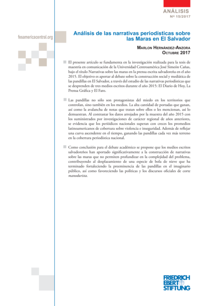 "Las pandillas no sólo son protagonistas del miedo en los territorios que controlan, sino también en los medios. La alta cantidad de portadas que ganan, así como la avalancha de notas que tratan sobre ellos o les mencionan, así lo demuestran. Al contrastar los datos arrojados por la muestra del año 2015 con los suministrados por investigaciones de carácter regional de años anteriores, se evidencia que los periódicos nacionales superan con creces los promedios latinoamericanos de cobertura sobre violencia e inseguridad. Además de reflejar una curva ascendente en el tiempo, ganando las pandillas cada vez más terreno en la cobertura periodística nacional. Como conclusión para el debate académico se propone que los medios escritos salvadoreños han aportado significativamente a la construcción de narrativas sobre las maras que no permiten profundizar en la complejidad del problema, contribuyendo al desplazamiento de una especie de bola de nieve que ha terminado fortaleciendo la preeminencia de las pandillas en el imaginario público, así como favoreciendo las políticas y los discursos oficiales de corte manodurista." (Página 1)
