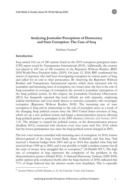 "The paper argues that journalists' perceptions of their role in challenging corruption and developing democracy will give us some insight into Iraq's "crisis of democracy". The theory of democratic participation focuses on the centrality of media and communication institutions, founded on the principle of social responsibility and particularly prevalent in capitalist countries. "Democratic participation" reflects the definition of freedom from the democratic and parliamentary systems that have become influential in this age (Wolinetz 2012). This argument is considered by a free press as a failure due to its subordination to a centralized government and owners of capital. Building from corruption reports, public opinion polls, and popular demonstrations, this study will reveal journalists' perceptions of their roles in covering corruption and democracy, investigating whether corrupt political parties and corrupt capitalists control the political system. Democracy in Iraq has created new uncertainties, especially as it is a society without experience with political pluralism. The political transition created civil violence and civil war in 2006." (Theoretical framework, page 2-3)