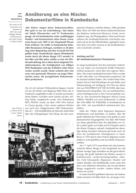 »Die Khmer mögen keine Dokumentarfilme. Hier geht es nur um Unterhaltung.« Das haben mir lokale Filmemacher und TV Produzenten gesagt, als ich Kambodschas erstes unabhängiges Medien- und Kunstzentrum Meta House (www.meta-house.com) 2007 in der Hauptstadt Phnom Penh eröffnete. Ich wollte zu Kambodschas kultureller Renaissance beitragen, nachdem es 30 Jahre lang unter Bürgerkrieg und dem Genozid Pol Pots gelitten hatte. Kambodschas eigene Filmindustrie wurde durch die Khmer Rouge 1975 zerstört. In den 80er und 90er Jahre erlebte es eine Art Wiederauferstehung, bis es dann durch steigende Produktionskosten, die Verfügbarkeit von billigen DVD Raubkopien und das Schließen vieler Kinos wieder zerstört wurde. Heute entsteht aber eine neue und spannende Filmszene um junge Filmemacher_ innen, die preisgekrönte Dokumentarfilme produzieren." (Seite 18)
