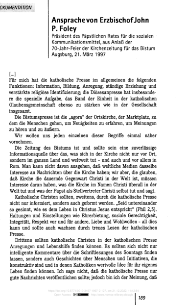 "Für mich hat die katholische Presse im allgemeinen die folgenden Funktionen: Information, Bildung, Anregung, ständige Erziehung und verstärkte religiöse Identifizierung; die Diözesanpresse hat insbesondere die spezielle Aufgabe, das Band der Einheit in der katholischen Glaubensgemeinschaft ebenso zu stärken wie in der Gesellschaft insgesamt. Die Bistumspresse ist die "agora" der Ortskirche, der Marktplatz, zu dem die Menschen gehen, um Neuigkeiten zu erfahren, um Meinungen zu hören und zu äußern." (Seite 189)