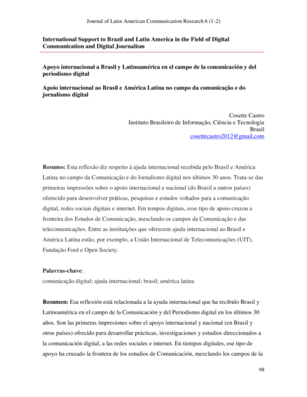 "Esta reflexão diz respeito à ajuda internacional recebida pelo Brasil e América Latina no campo da Comunicação e do Jornalismo digital nos últimos 30 anos. Trata-se das primeiras impressões sobre o apoio internacional e nacional (do Brasil a outros países) oferecido para desenvolver práticas, pesquisas e estudos voltados para a comunicação digital, redes sociais digitais e internet. Em tempos digitais, esse tipo de apoio cruzou a fronteira dos Estudos de Comunicação, mesclando os campos da Comunicação e das telecomunicações. Entre as instituições que oferecem ajuda internacional ao Brasil e América Latina estão, por exemplo, a União Internacional de Telecomunicações (UIT), Fundação Ford e Open Society." (Resumo)