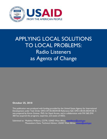 "This report documents the results of a two-month field research evaluation in Niger and Chad on the media component of the Peace Through Development (PDEV) program funded by USAID under the Trans-Saharan Counterterrorism Partnership (TSCTP). Equal Access, a non-governmental organization (NGO) specializing in development communications, implements the media component of the PDEV project and works in collaboration with the Academy for Educational Development (AED) to 1) improve local governance in target communities; 2) empower at-risk youth to become active participants in their communities and the economy; and 3) render superfluous ideologies that promote violence. The major activity of the PDEV media component is the production of four radio programs (two in Niger and two in Chad), which are broadcast by a network of PDEV radio partners in each country. The radio programs are supplemented by community-level activities including the organization of listening clubs, the training of community reporters and ongoing training and material support offered to radio station partners in both Chad and Niger." (Executive summary)