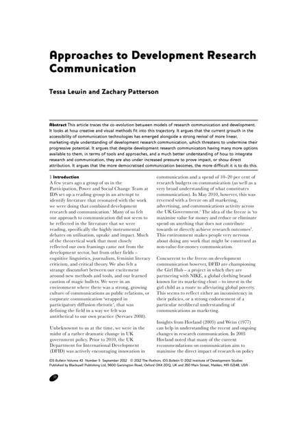 "This article traces the co-evolution between models of research communication and development. It looks at how creative and visual methods fit into this trajectory. It argues that the current growth in the accessibility of communication technologies has emerged alongside a strong revival of more linear, marketing-style understanding of development research communication, which threatens to undermine their progressive potential. It argues that despite development research communicators having many more options available to them, in terms of tools and approaches, and a much better understanding of how to integrate research and communication, they are also under increased pressure to prove impact, or show direct attribution. It argues that the more democratised communication becomes, the more difficult it is to do this." (Abstract)