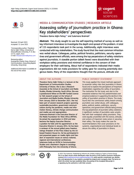 "This study sought to use the self-reporting method of survey as well as key informant interviews to investigate the depth and spread of the problem. A total of 115 respondents took part in the survey. Additionally, eight interviews were conducted with key stakeholders. The study found that the most common infraction was verbal abuse. Colleagues, police, political fanatics, politicians, security operatives and government officials, were among the top perpetrators of safety violations against journalists. A sizeable portion (albeit fewer) were dissatisfied with their workplace safety provisions and minimal confidence in the concern of their employers for their well-being. About half of respondents indicated their media organisations did not make provisions for safety gear for covering potentially dangerous beats. Many of the respondents thought that the posture, attitude and actions of key state actors, law enforcement agencies as well as their own association (GJA) concerning their safety were unsatisfactory. The study recommends that the government ensures the security and safety of journalists and media organizations. Media organizations must ensure a safe and toxic-free work environment through codes of practice, policies, and enforcement; and journalists become familiar with the various types of safety breaches and corrective measures that can be taken." (Abstract)