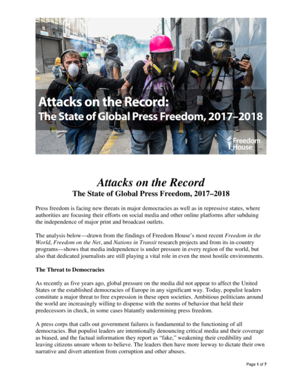 "Press freedom is facing new threats in major democracies as well as in repressive states, where authorities are focusing their efforts on social media and other online platforms after subduing the independence of major print and broadcast outlets. The analysis below—drawn from the findings of Freedom House’s most recent Freedom in the World, Freedom on the Net, and Nations in Transit research projects and from its in-country programs—shows that media independence is under pressure in every region of the world, but also that dedicated journalists are still playing a vital role in even the most hostile environments." (Abstract)
