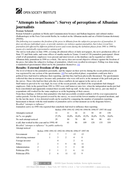 "The following text examines the freedom of the press in Albania from the subjective perspective of journalists. It does not discuss individual cases, or provide statistics on violence against journalists, but it does reveal how journalists felt affected by different political actors and events during the turbulent phases from 1991 to 1998 by means of a statistically representative opinion poll." (Page 1)