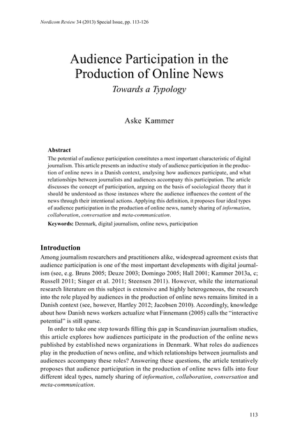 "The potential of audience participation constitutes a most important characteristic of digital journalism. This article presents an inductive study of audience participation in the production of online news in a Danish context, analysing how audiences participate, and what relationships between journalists and audiences accompany this participation. The article discusses the concept of participation, arguing on the basis of sociological theory that it should be understood as those instances where the audience influences the content of the news through their intentional actions. Applying this definition, it proposes four ideal types of audience participation in the production of online news, namely sharing of information, collaboration, conversation and meta-communication." (Abstract)